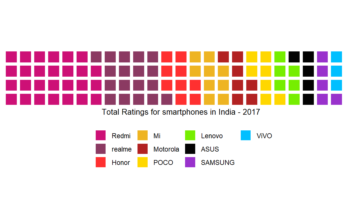 Returning to the previous analysis about smartphones in India, we will se who was the most important player from that time using waffle plots.
