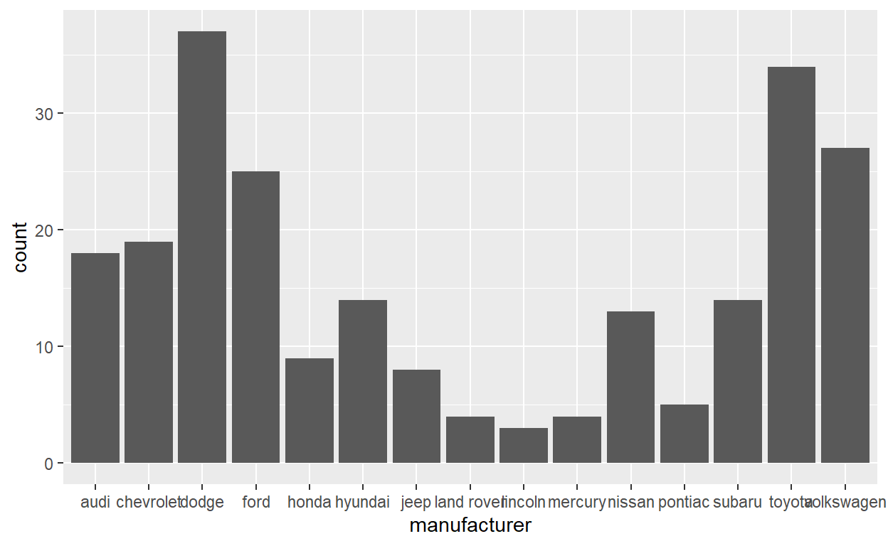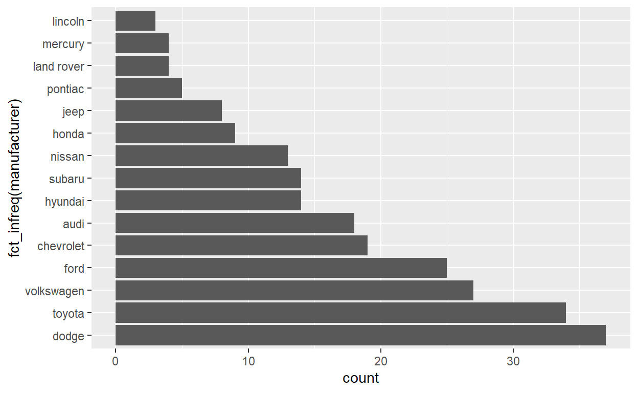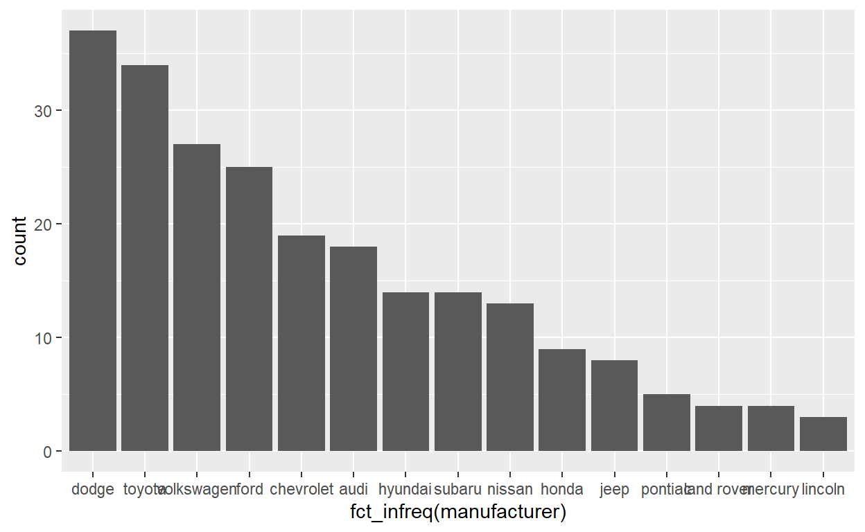 geom_bar(mapping = aes(x = fct_infreq(manufacturer)))