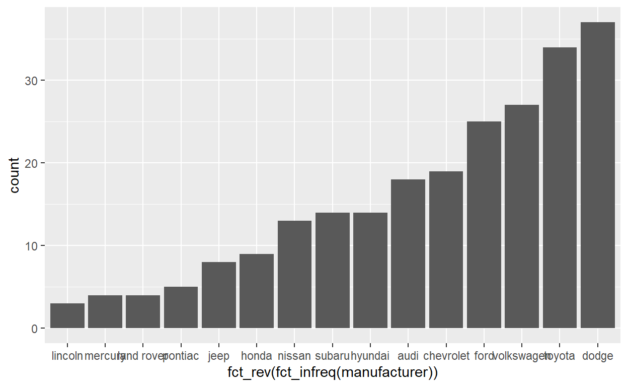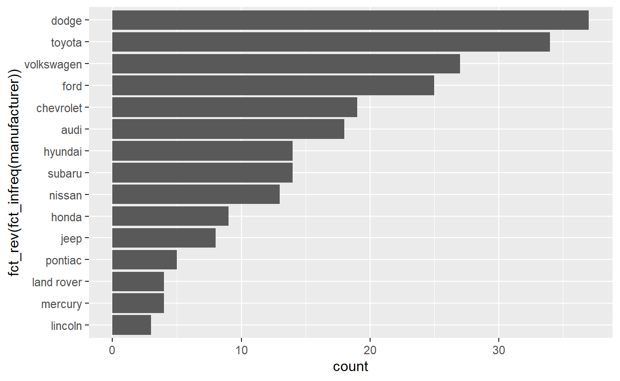 geom_bar(mapping = aes(x = fct_rev(fct_infreq(manufacturer))))