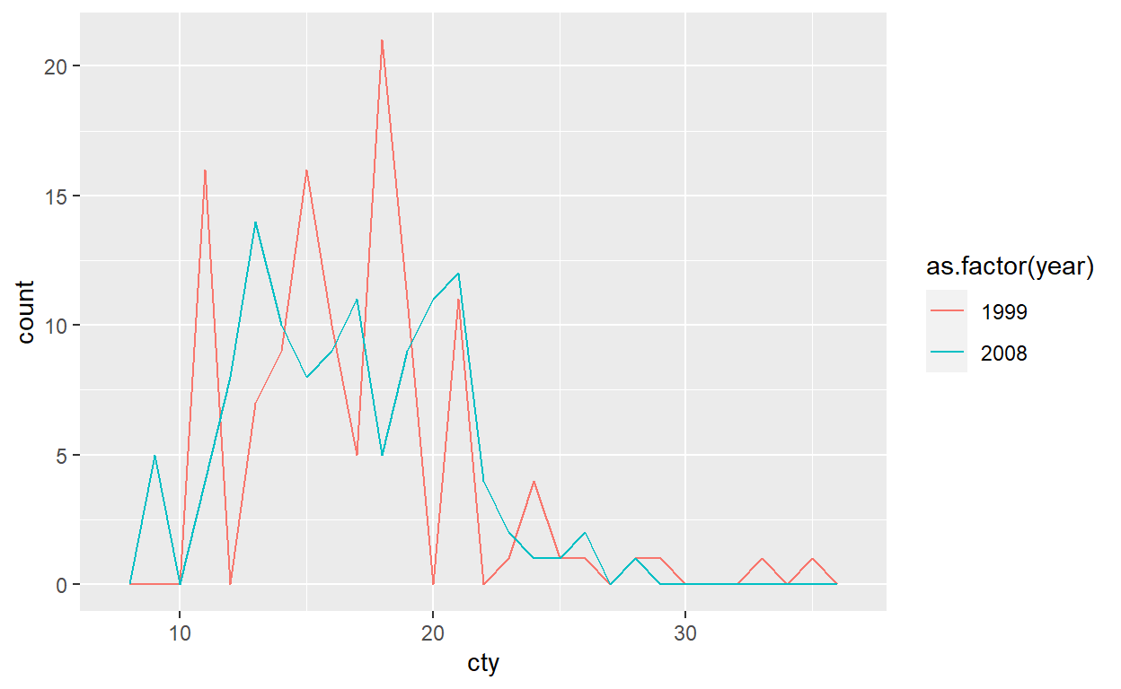 ggplot(data = mpg, mapping = aes(x = cty, color = as.factor(year))) +