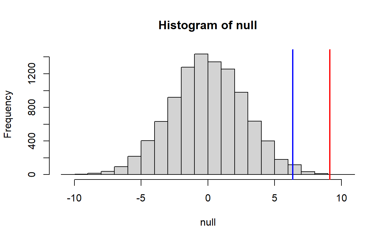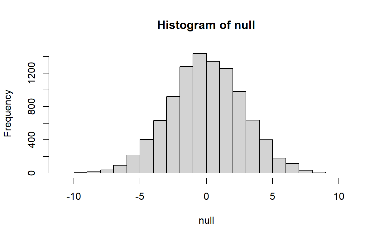 Here we have repeated 10.000 times the differences between means to create a null distribution: