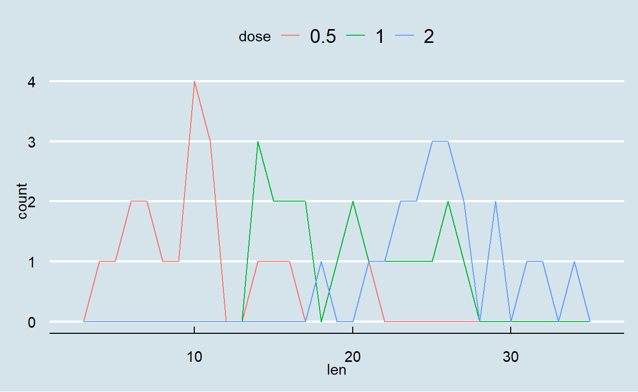 ggplot(ToothGrowth) + geom_freqpoly(aes(x = len, color = dose), binwidth = 1) + theme_classic()