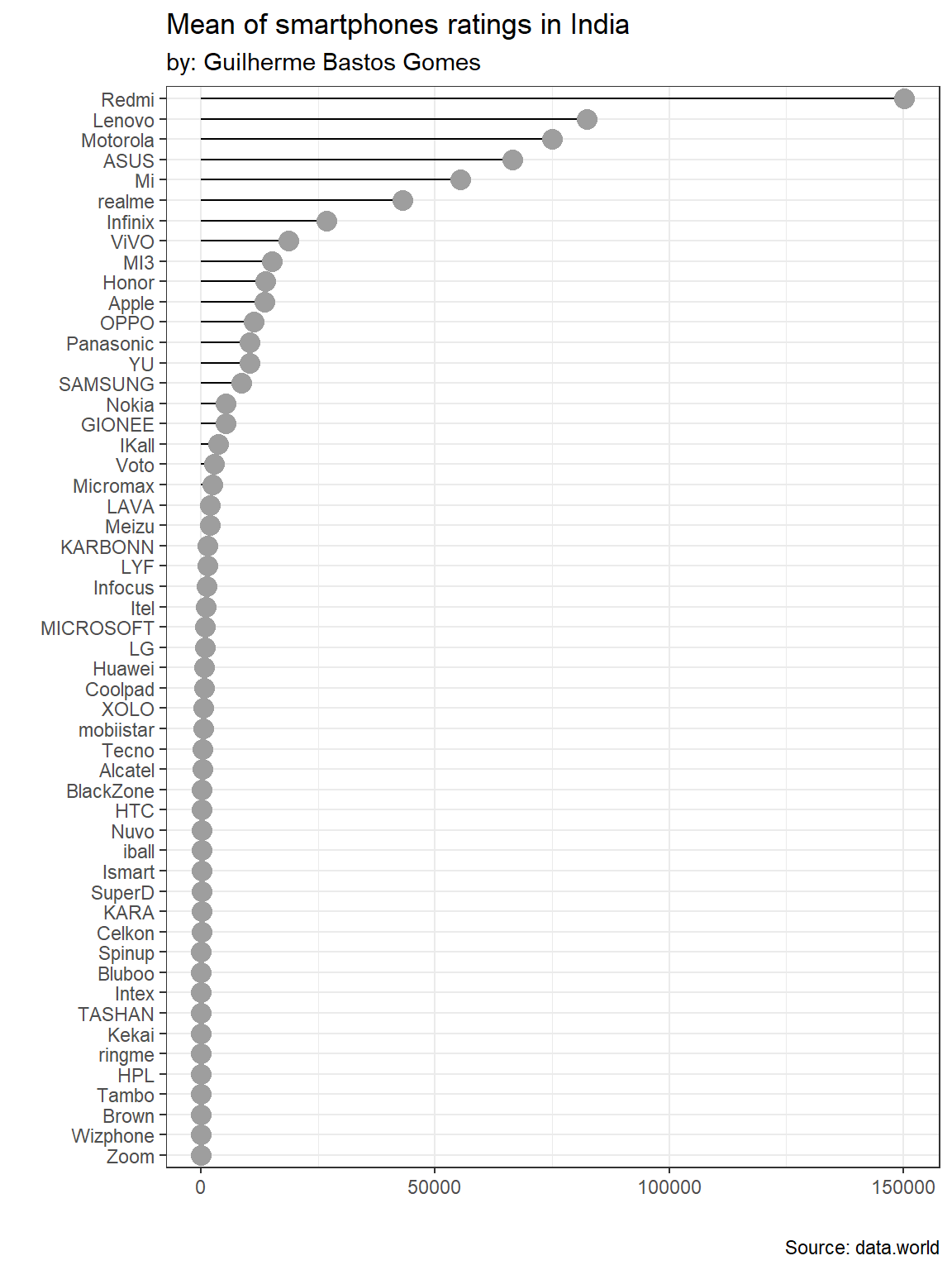 In the data.world platform I have found a data set with data from smartphones in India where it’s possible to find several models, their prices and ratings. In this post, I will use the tools and skills have developed so far to explore and analise these data.